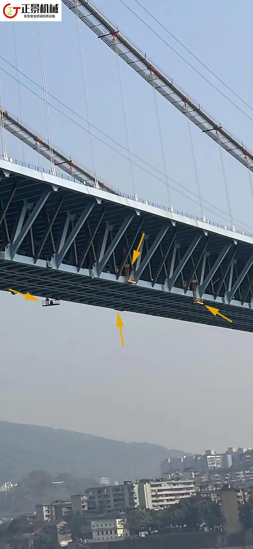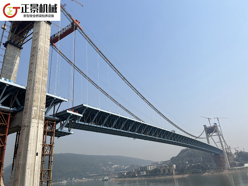 3月15日上午,隨著最后一塊鋼桁梁的成功吊裝,國內(nèi)最大跨度公軌兩用懸索橋——郭家沱長江大橋成功合龍,預(yù)計今年內(nèi)將具備通車條件。由正景機械研制的四臺橋上單邊施工車有幸參與這一歷史時刻。